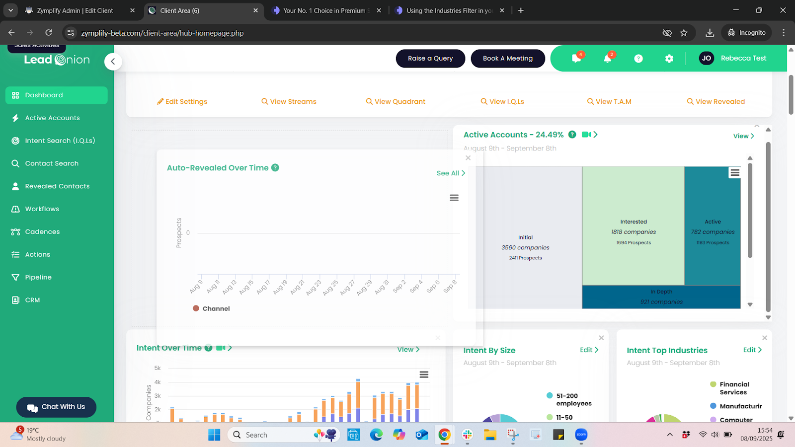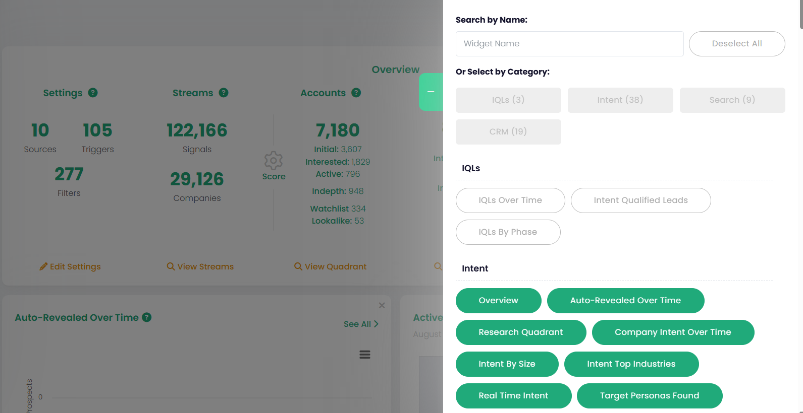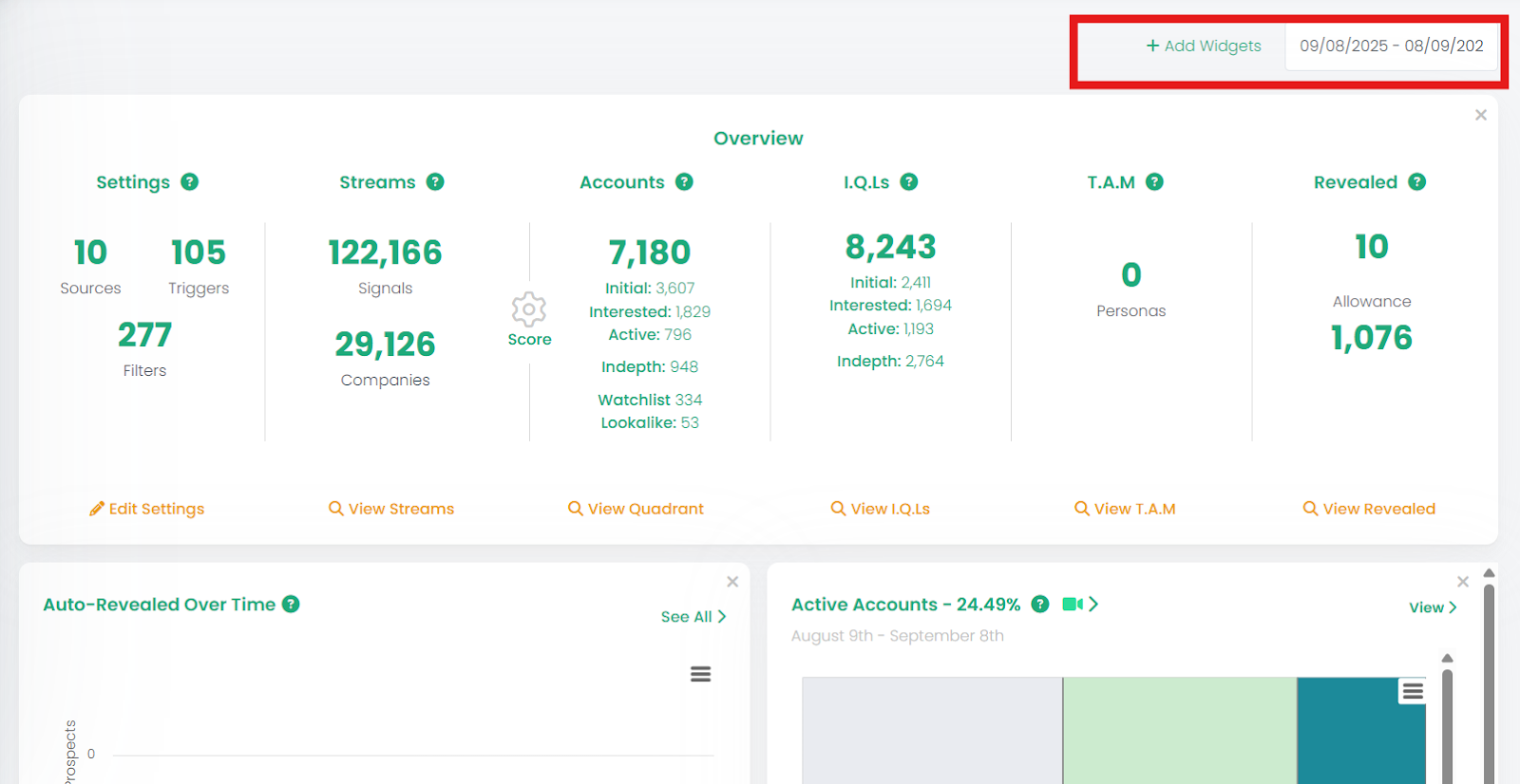 Your Dashboard is the central hub where you can view key business metrics and monitor the health of your data in real time. With preset widgets available, you can quickly customise the dashboard to focus on what matters most to you — from prospecting to intent insights.