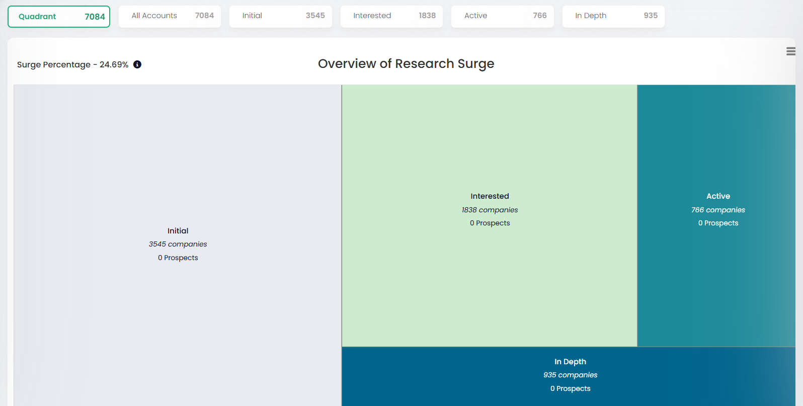 - Surge Quadrant combines spikes with overall research intensity to show where in the buying journey an account is.