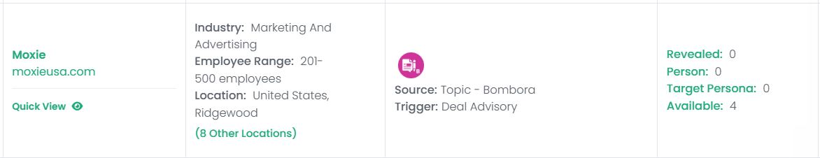 This company only showed one topic (“Deal Advisory”). Since it didn’t reach the higher thresholds, it counts as a 1 Spike.