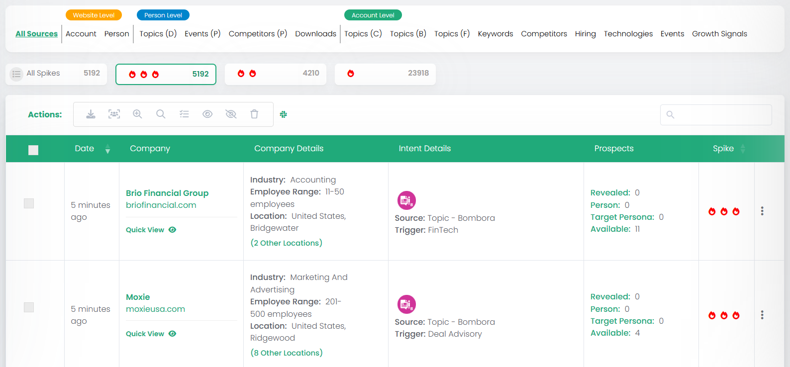 The All Spikes page provides a centralised view of every company showing intent. From here you can: