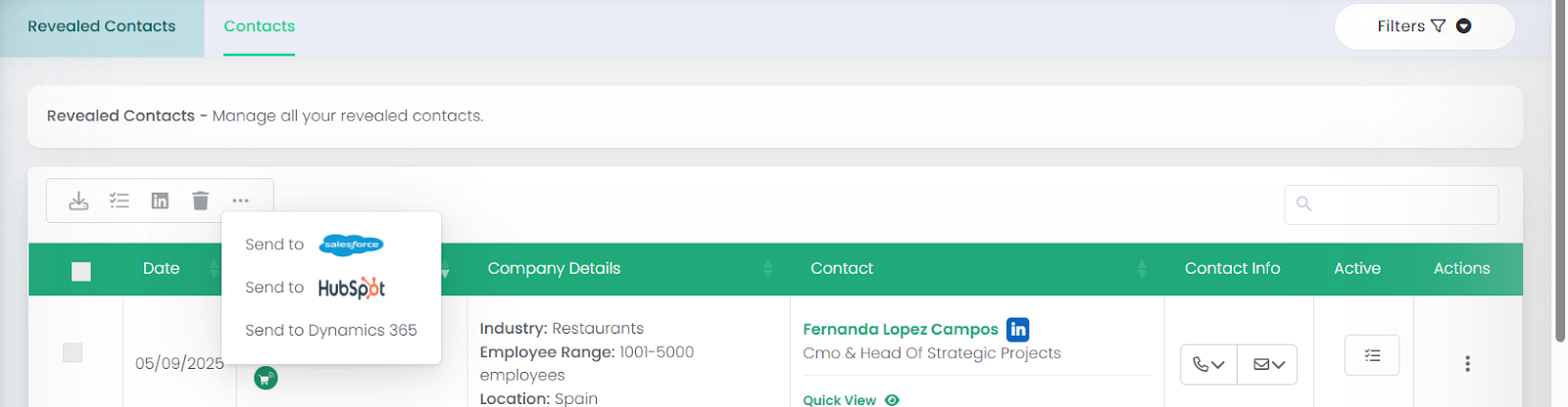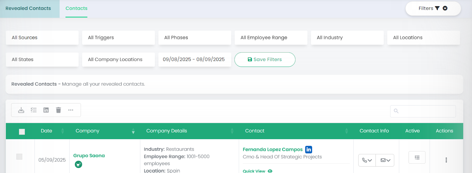 Revealed Contacts is your central hub for every prospect you’ve unlocked — whether through Intent Searches or Contact Searches.