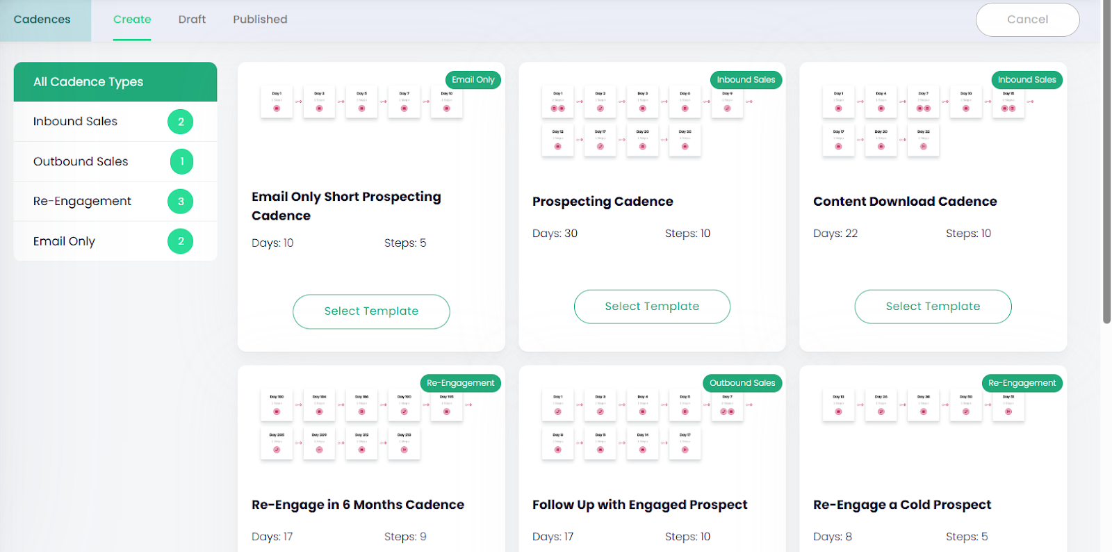 - If you choose Template, you’ll see options such as inbound sales, outbound sales, re-engagement, and email-only cadences. Click Select Template to begin.