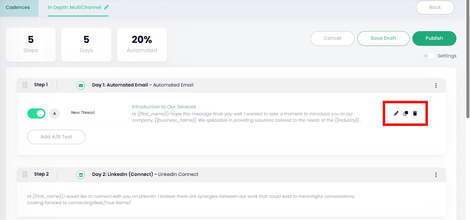 Once your cadence is created, you can build and refine the sequence of steps (emails, calls, LinkedIn actions, or tasks) that make up the outreach flow.