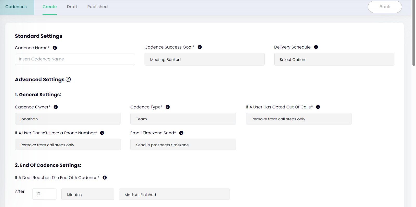 - Advanced Settings → Decide cadence owner, set type (team or private), choose time zone (prospect or dashboard), and define rules for prospects without phone numbers or call opt-outs.