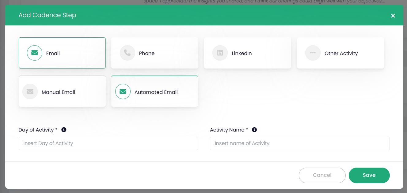 - Choose from step types such as Automated Email, Manual Email, LinkedIn Connect, LinkedIn Message, Call, or Task.