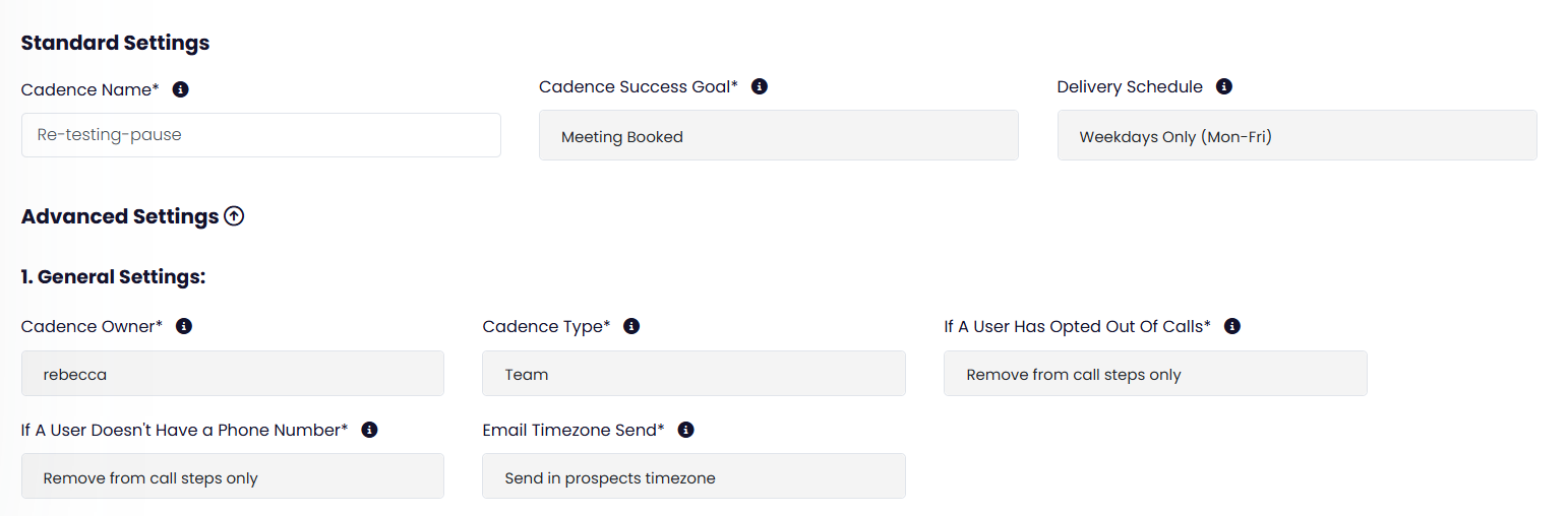 - Cadence Success Goal → Choose the key outcome (e.g. Meeting Booked, Won Deal) to measure success.