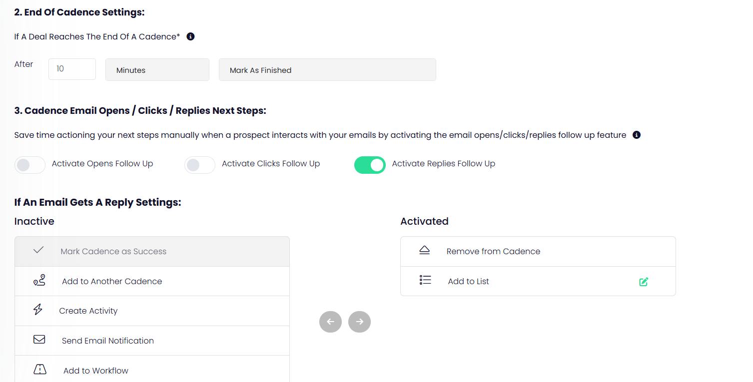 - End of Cadence Settings → Decide what happens when a deal reaches the end of a cadence (e.g. mark as finished, recycle into a list).